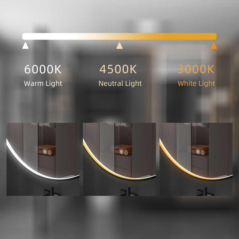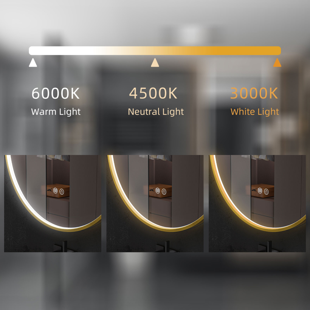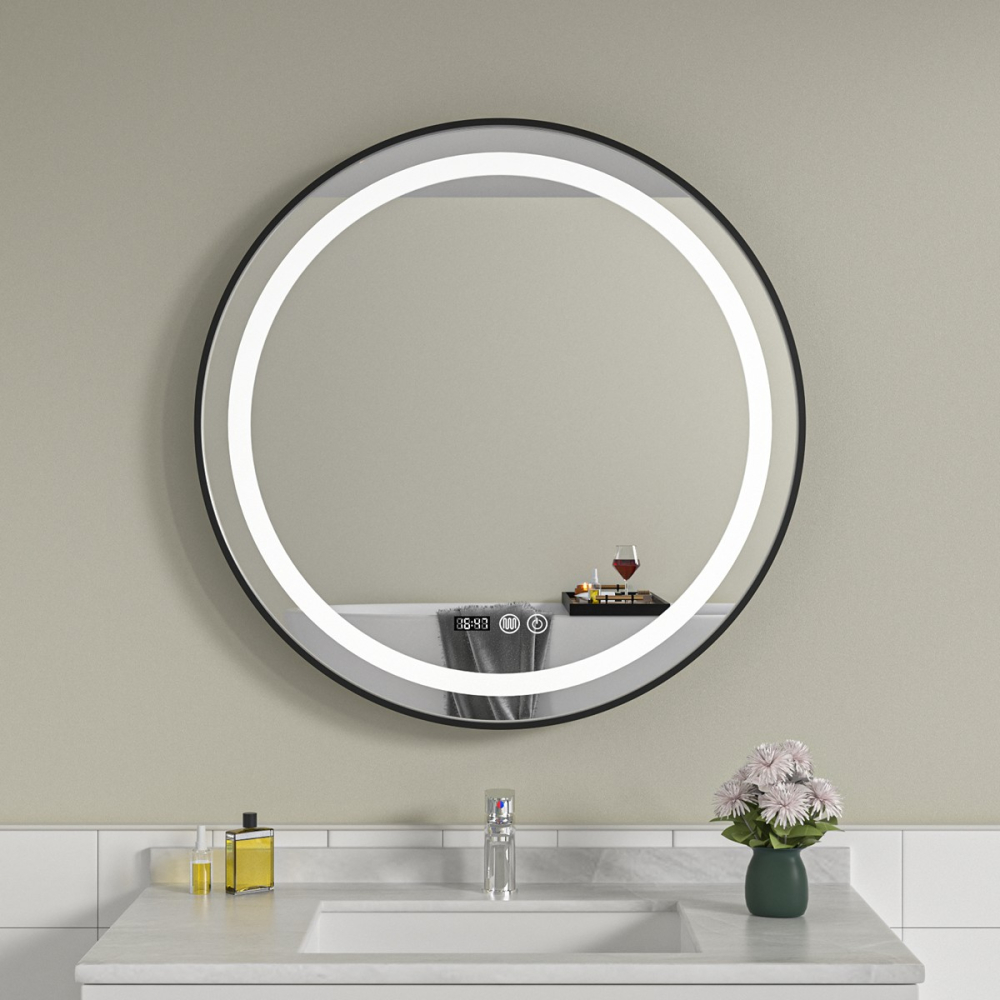Oglinda baie led rodtunda 90×90, rama neagra. Trei tipuri de iluminare