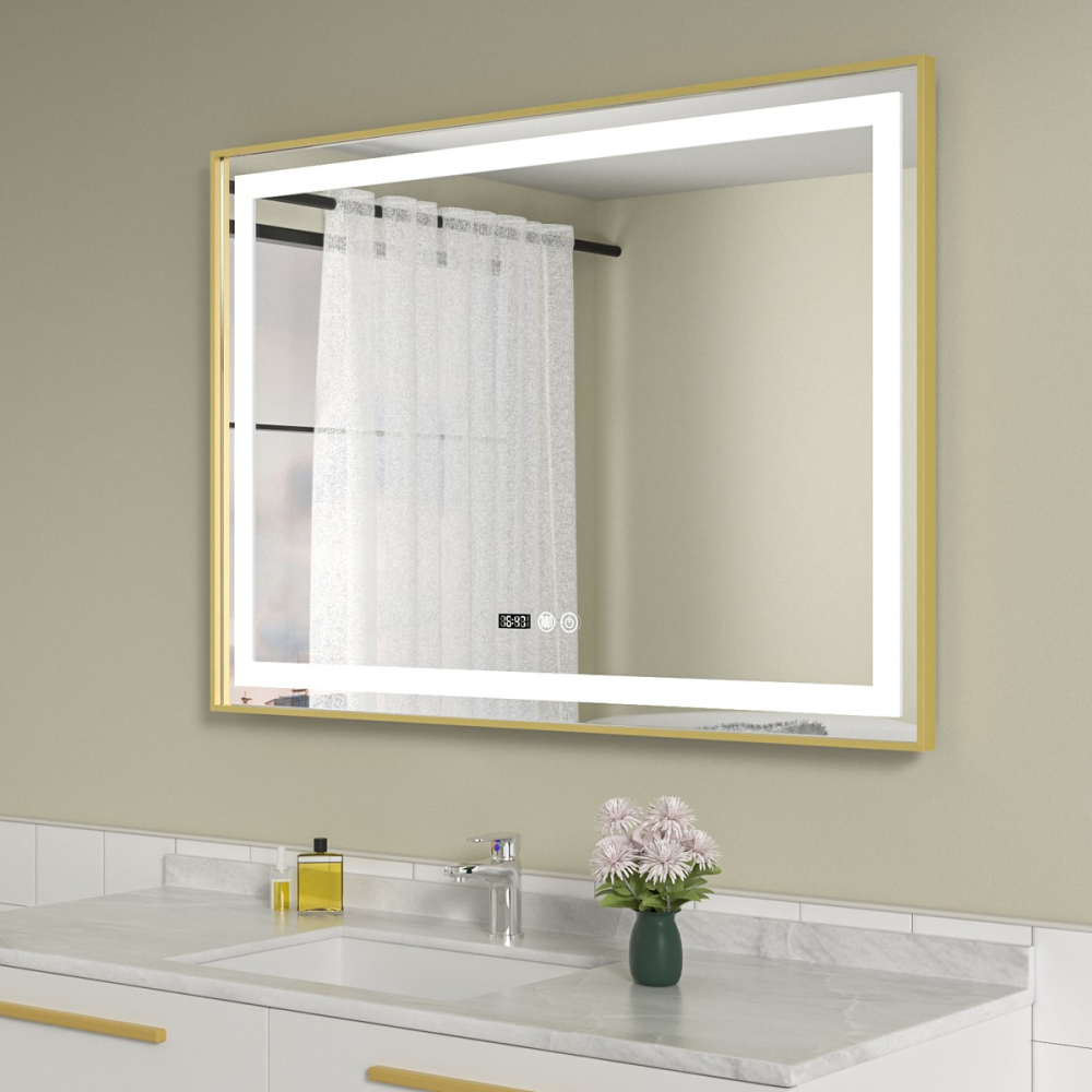 Oglinda baie led 100×70 cu rama din aluminiu aurie